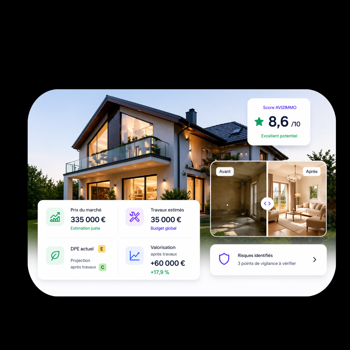 👉 Lancer une estimationVous obtenez une vision claire du bien ou des travaux : potentiel, risques, coûts, valorisation, durée, DPE.