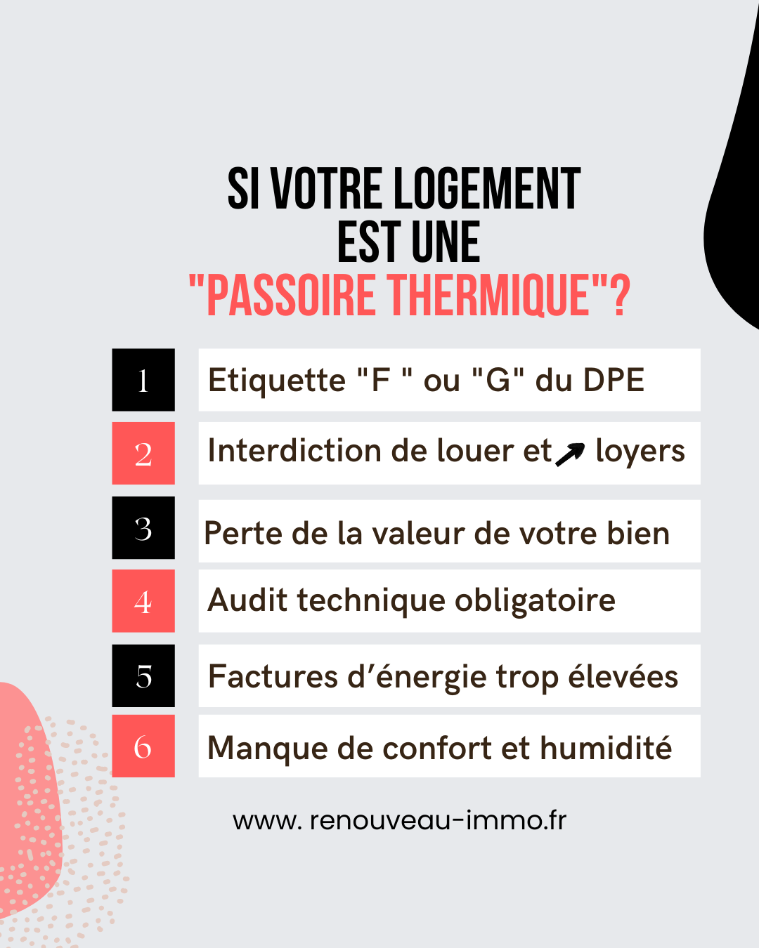 Passoire thermique est un terme qui désigne les logements dont le diagnostic de performance énergétique (DPE) est classé F ou G, car ils consomment plus de 330 kWh/m2 et par an. Ce sont les logements mal isolés et demandent davantage d'énergie pour être convenablement chauffés.